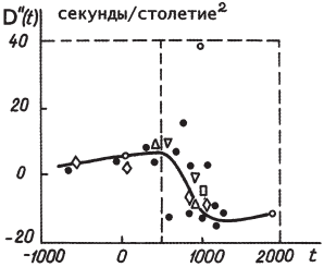 Р. Ньютон вычислил 12 значений D'', основываясь на 370 наблюдениях древних затмений — по датам, взятым из составленных историками хронологических таблиц. Сведения о движении Луны в более близкие к нам времена он взял из трудов астронома Мартина, который обработал около 2000 телескопических наблюдений Луны за период 1627–1860 годы. В итоге Р. Ньютон построил кривую зависимости D" от времени (рис. 20).