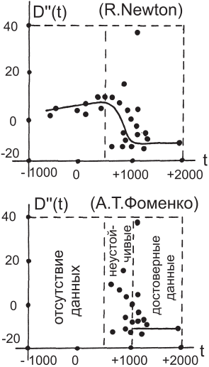 Рис. 21. Внизу показана новая кривая второй производной лунной элонгации, вычисленная А.Т. Фоменко. Основана на новых, исправленных датировках «античных» затмений, оказавшихся на самом деле средневековыми. Необъяснимый скачок ускорения Луны здесь полностью исчезает.