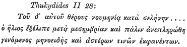 Однако на самом деле текст Фукидида читается однозначно, и в том, что звезды при этом затмении в самом деле сверкали на почерневшем небе, сомневаться не приходится: «Тем же летом в новолуние (когда это, видимо, только и возможно) после полудня произошло солнечное затмение, а затем солнечный диск снова стал полным. Некоторое время солнце имело вид полумесяца, и на небе появилось даже несколько звезд».