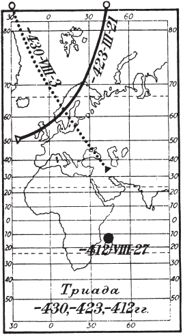 Описанная Фукидидом триада затмений — прекрасная находка для историков. Хотя полные солнечные затмения, в отличие от частичных (когда солнце не полностью закрывается луной, небо лишь слегка темнеет и в сиянии солнечного серпа или кольца никакие звезды не видны), происходят очень редко, за сотни и тысячи лет на территории Греции наблюдались они неоднократно. Выбрать из них то единственное, которое нужно для точной привязки названных Фукидидом дат, должны помочь второе и третье затмения. Поэтому неудивительно, что указанные затмения с самого начала, как только возникла историческая хронология, стали материалом для изучения и расчетов. Упоминавшийся средневековый хронолог Дионисий Петавиус (XVII век) подобрал для затмений такие даты: первое — 3 августа 431 года до н. э., второе — 21 марта 424 года до н. э., третье — 27 августа 413 года до н. э. (рис. 23).