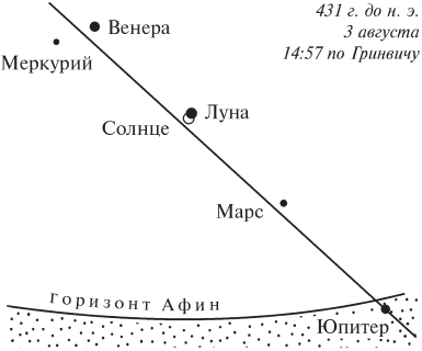 Рис. 24. Расположение планет в момент затмения 431 года до н. э. Венера, Марс и Меркурий находились близко от Солнца и при заметно открытом солнечном диске не могли быть видны. Юпитер находился под горизонтом; Сатурн далеко на юге, и, как справедливо отмечает Гинцель, его видимость была «весьма сомнительной».