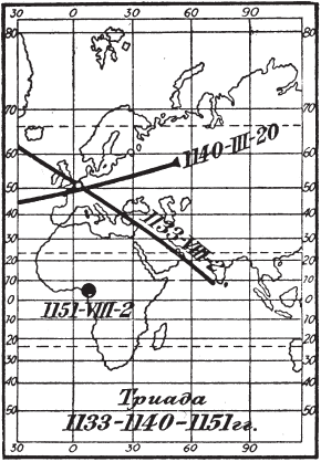 Рис. 25. Триада затмений, описанная «античным» Фукидидом: 1133,1140 и 1151 годы н. э. Точное решение найдено Н.А. Морозовым. Показаны полосы прохождения лунной тени для первых двух затмений и точка зенитной видимости для лунного затмения 1151 года.