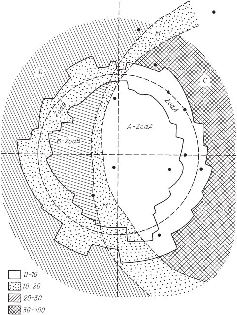 Рис. 32. Семь областей (характеризуемых различной точностью измерений координат звезд), обнаруженных нами на звездном атласе «Альмагеста». Черными точками отмечены именные звезды.