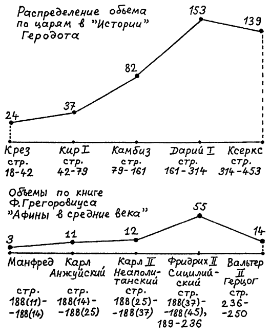 Рис. 35. Сравнение графиков объемов «биографий» средневековых правителей и якобы античных царей древней Персии, описанной Геродотом. Распределение объемов достаточно похоже.