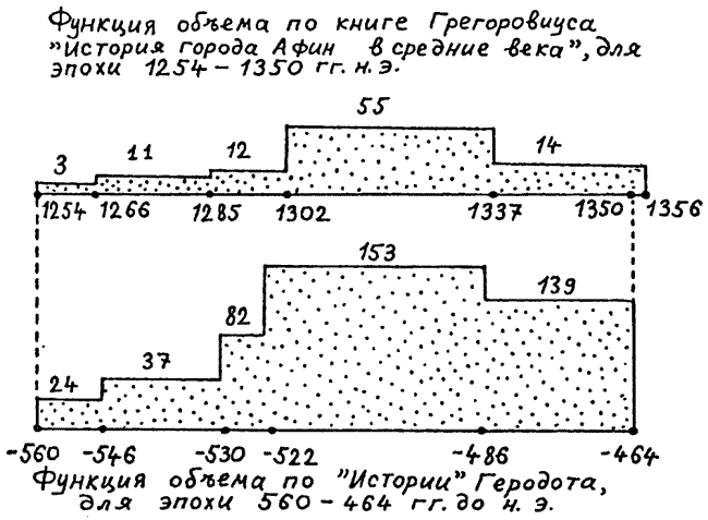 Рис. 34. Сравнение графиков объемов книги Грегоровиуса «История города Афин в средние века» с функцией объемов «Истории» якобы античного Геродота. У Грегоровиуса описан период 1254–1350 годы н. э., а у Геродота — 560–464 годы до н. э. По горизонтали отложены годы, а по вертикали — объемы. Эти графики достаточно похожи.