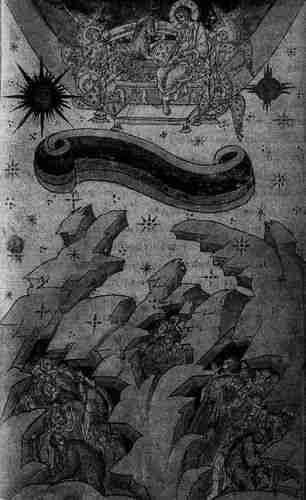 Рис. 93. Рисунок из рукописи Апокалипсиса, датируемой XVI веком, рисунок подчеркивает, что действие происходит НА ЗВЕЗДНОМ НЕБЕ. Рукопись хранится в Российской государственной библиотеке, Москва, Ф. 98, номер 1844, л. 26, об. Взято из [745], т. 8, с. 446.