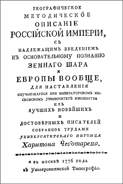 Рис. 6.86. Титульный лист «Географического описания Российской Империи» Харитона Чеботарева, напечатанного в Москве в Университетской типографии в 1776 году.