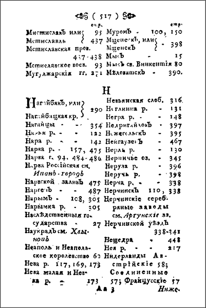 Рис. 6.87. Страница из указателя географических имен к «Географическому описанию Российской Империи» 1776 года. Река Непрядва в указателе отсутствует.