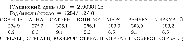 Расположение планет 8 декабря 1284 года показано на рис. 7.11. На рис. 7.12 показан вечерний горизонт египетского Луксора 8 декабря 1284 года в 16:00 по Гринвичу, в момент захода Юпитера под местный горизонт.