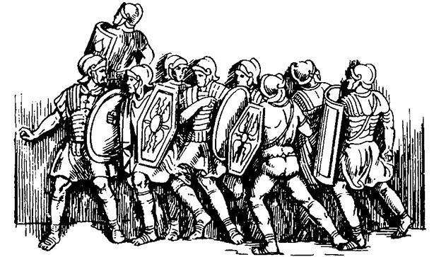 Упоминание о строе в виде рыбьей чешуи очень любопытно. Трудно представить, что оно может подразумевать нечто иное, кроме маневра с перекрывающимися щитами. Наиболее знаменитая тактика построения со щитами называлась testudo («черепаха»). Она была доведена до совершенства в конце I в. до н. э.: квадрат легионеров соединял щиты сверху и со всех сторон, что давало им полное укрытие от вражеского огня.