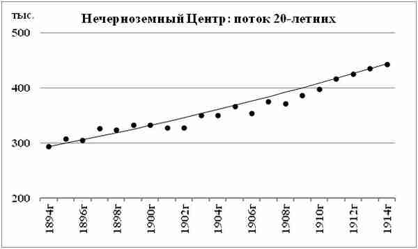 Как видите, колебания в потоке 20-летних Нечерноземного Центра, относительно линейного тренда, небольшие. Ежегодный прирост 20-летних — около 2%. До 1914 года не было больших катаклизмов ни в природных условиях Русской равнины, ни в социальной сфере Царской России. Поток 20-летних показывает: демографическое развитие Нечерноземного Центра «накануне» падения Царства Романовых вполне равномерное.