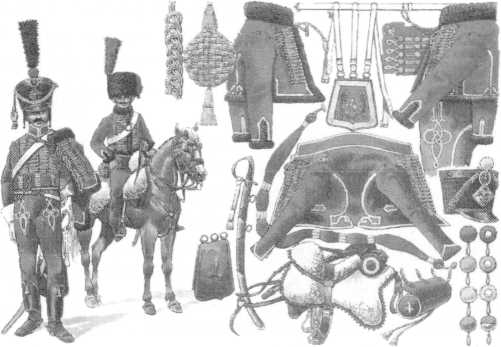 Гусарський мундир 1812 року складався з таких елементів: коротку (до талії) суконну куртку з коміром стійкою — доломан, поверх якого надягали ще одну куртку — ментик, вузькі рейтузи — чикчири і короткі чобітки — ботики, прикрашені чорною вовняною китичкою. Навколо пояса гусари носили кушак — сітку зі шнурів із перехопленнями (гомбами). Чорний, обшитий шкірою головний убір — ківер — прикрашали білим султаном, етишкетами (шнурами) і репейком. Кокарду робили у вигляді круглої розетки з чорної стрічки з помаранчевими облямівками і з металевою петлицею за кольором ґудзиків. Підборідний ремінь ківера покривався пласкою металевою лускою. До гусарської уніформи можна також віднести і ташку — пласку шкіряну сумку, прикрашену галуном і вензелем, що її носили ззаду на лівому боці, прикріпленою до портупеї.