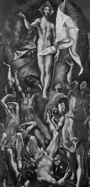 Рис. 2.4. «Воскресение Христа». Эль Греко. Якобы около 1590 года. Прадо. Мадрид. Христос держит в руке знамя, длинное древко которого некоторые писатели могли интерпретировать как копье или стрелу, «на которой летал» Иисус-Пифагор. Взято из [143:0], с. 417.