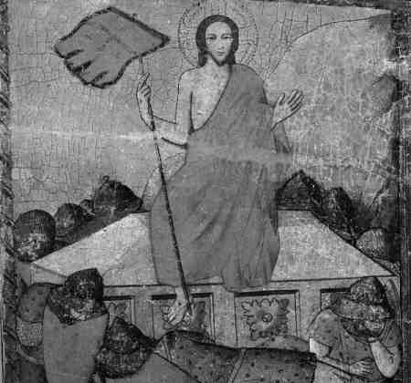 Рис. 2.5. Воскресение и Вознесение Христа. Христос держит в руке знамя на длинном древке. Некоторые авторы могли описывать древко как стрелу или копье, на котором «взлетел» Христос. Изображение якобы 1320–1330 годов. Ватикан. Взято из [713], с. 87.