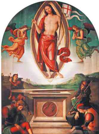 Рис. 2.6. «Воскресение». Перуджино. Якобы 1499–1500 годы. Христос возносится на небо, держа в руке древко знамени. Ватикан. Взято из [713], с. 148.