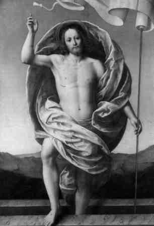 Рис. 2.7. «Воскресший Христос». Гауденцио Феррари. Христос возносится на небо, держа в руке знамя. Древко знамени поздние писатели, забывшие суть дела, вполне могли интерпретировать как «стрелу, на которой взлетел Пифагор-Христос». Взято из [40:1], с. 181, илл. 181.