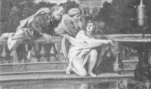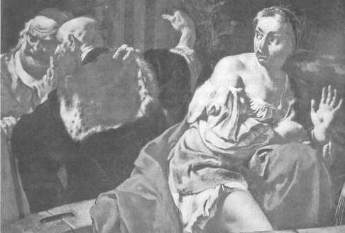 Библейский рассказ о Сусанне содержится в известной книге Даниила. Вот вкратце суть сюжета. Красивая и молодая Сусанна, жена Иоакима, приглянулась двум старейшинам-судьям, возжелавшим ее. Они тайком проникают в ее дом и требуют «удовлетворения». В противном случае (если она откажется) угрожают обвинить Сусанну в прелюбодеянии с неким юношей (чего на самом деле не было). Сусанна отказывается, рис. 5.7. Тогда ее облыжно обвиняют. Происходит суд, где пророк Даниил устанавливает истину, обвиняет обоих старейшин в похоти и лжи и спасает Сусанну.
