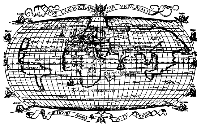2) Карта мира Иоахима фон Ватта (Joachim von Watt) якобы 1534 года. Дата записана в виде M.D.XXXIIII, то есть с разделительными точками, см. рис. 116 и 117.
