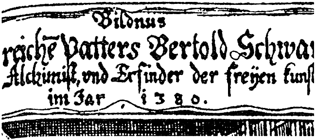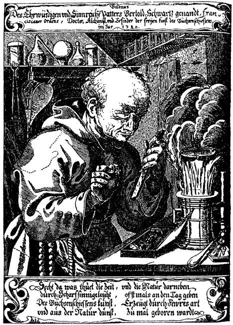 Рис. 127. Старинная гравюра, изображающая Бертольда Шварца, изобретателя пороха. Дата на гравюре записана с использованием латинской буквы I вместо единицы, как сегодня. Взято из [1121:1], вклейка после титульного листа книги.