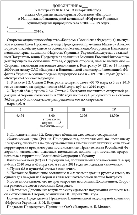 Реально эта цена была идентична той, о которой на 2009 год в свое время договорилась Юлия Тимошенко, посаженная Януковичем в тюрьму. Но Тимошенко настояла на взаимоувязке цены на газ с ценою на транзит российского газа через Украину — повышение цены на газ вело к автоматическому повышению цен его транзита. В «Харьковских соглашениях» Януковича этот пункт отсутствовал. Правда, Янукович настоял, чтобы из газового контракта 2009 года был изъят пункт 6.6, который предполагал штрафные санкции для Украины, если она приобретала газа на 6% меньше месячного объема поставок[42].