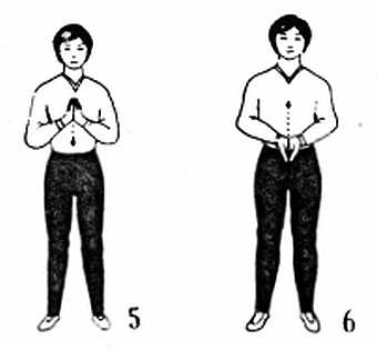 Ладони сведите вместе пальцами вверх. Поместите руки перед грудью и опустите их, разгибая в локтях 36 раз к нижней части живота (рис. 5–6).