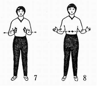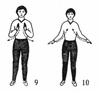Ладони направьте друг на друга перед грудью, сведите и разведите их 5 раз, а затем вычерчивайте иероглиф «восемь», двигая руками вверх — вниз 36 раз (рис. 7-10).
