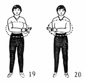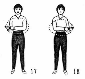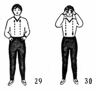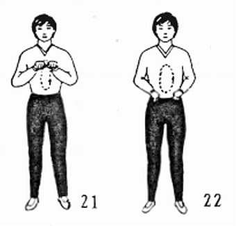 в) одновременно поднимайте обе руки ладонями вниз пальцами друг к другу и поместите их в 10 см над точкой байхуэй на голове. Выполните 20 вращательных движений по часовой стрелке и медленно опустите их вниз, пронося ладони на расстоянии 5 см от лица, шеи, груди, живота и бедер. Нагибаясь одновременно с опусканием рук, пронесите ладони мимо коленей и направьте пальцы в пол (если вы страдаете гипертонией, болями в пояснице и ногах или чувствуете себя неважно, можно не наклоняться);