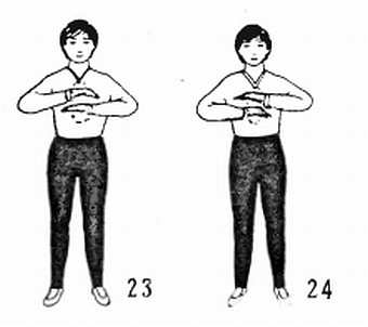 Поставьте кисти перед собой на уровне груди ладонями вниз. Выпрямляя руки вперед, слегка разогните пальцы. Затем, описывая круг, опустите их вниз и поднимите к груди. Пальцы при этом сожмите в полые кулаки. Выполните 36 раз (рис. 21–22).