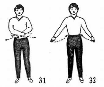 Скрестите руки перед животом так, чтобы правая рука была снаружи, а левая — внутри. 36 раз выполните качающие движения руками в стороны и обратно (рис. 31–32).
