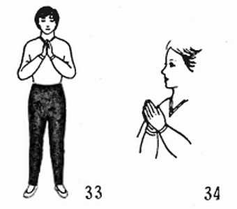 Сведите кисти перед грудью, пальцы направлены вперед вверх. Сохраняйте эту позу в течение трех минут (рис. 33–34).