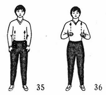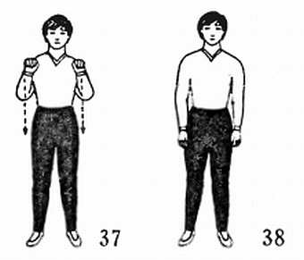 Возвращение в исходное положение. Медленно опустите руки, а затем, согнув пальцы в полые кулаки, вновь их поднимите до уровня плеч. Одновременно с этим вдыхайте через нос. Вместе с плавным выдохом через рот медленно опустите руки и расправьте пальцы. Разотрите ладони друг о друга, протрите ими лицо и помассируйте больное место (рис. 35–38).