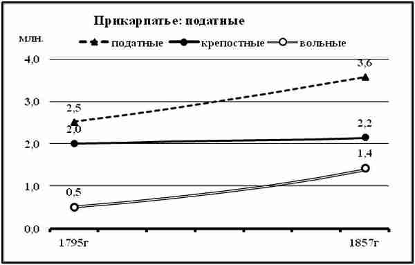 Земли Прикарпатья были присоединены к Царской России значительно позднее Среднего Приднепровья. Это произошло лишь после разделов Королевства Польши. Поэтому динамику численности податных Прикарпатья можно оценить лишь на интервале 1795–1857 годы — диаграмма 16.1.