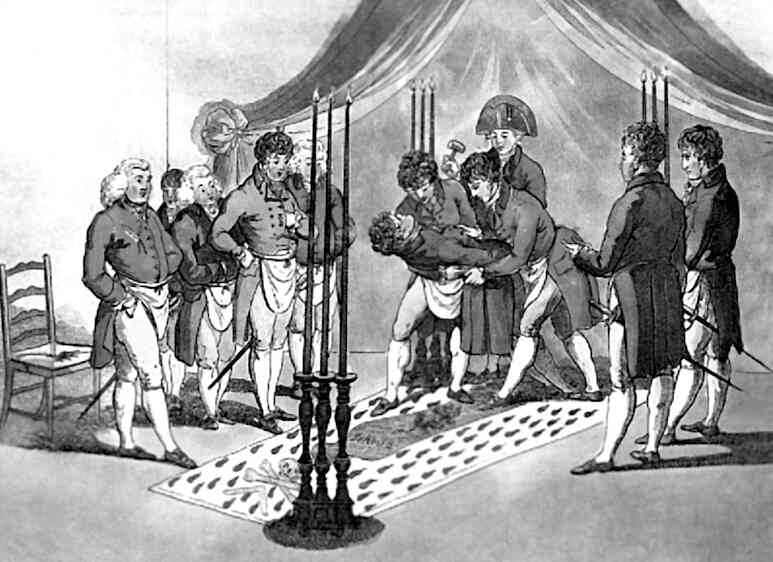 Посвящаемого кладут на табель третьего градуса; на табели, расстеленной на полу, прорисован знак: череп и кости