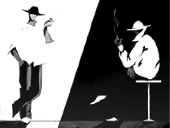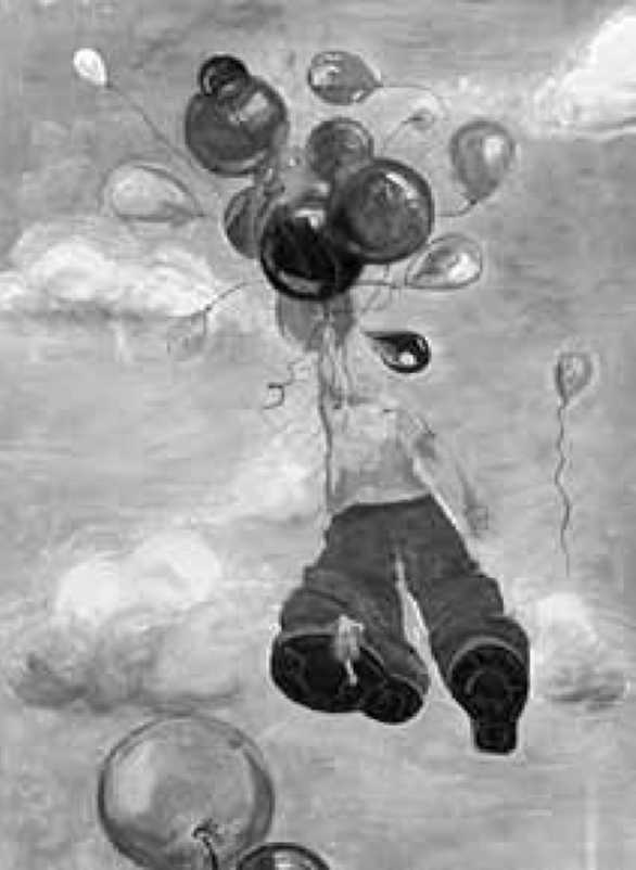 Герой взлетает на воздушном шаре — и одновременно падает, потому что его к земле притягивают тяжёлые ботинки[6] Два ковбоя в модных шляпах курят сигары, осве(я)щённые невидимой талией героини, именно из этой талии, опять-таки расположенной в центре картины, и сотканы тёмные фигуры гламурных персонажей по принципу минус-приёма.