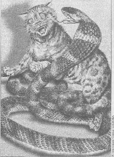 Урчащий рыжеватый комок метнулся вперед мимо ног Аманды, и Пол громко вскрикнул. Шерсть дыбом, зубы оскалены, когти выпущены — живой Снаряд врезался в змею. Черное гладкое тело метнулось вперед, мелькнула страшная пасть с острыми зубами. Кошачьи зубы сомкнулись на шее змеи как раз в тот момент, когда она ужалила нападавшего в бок.
