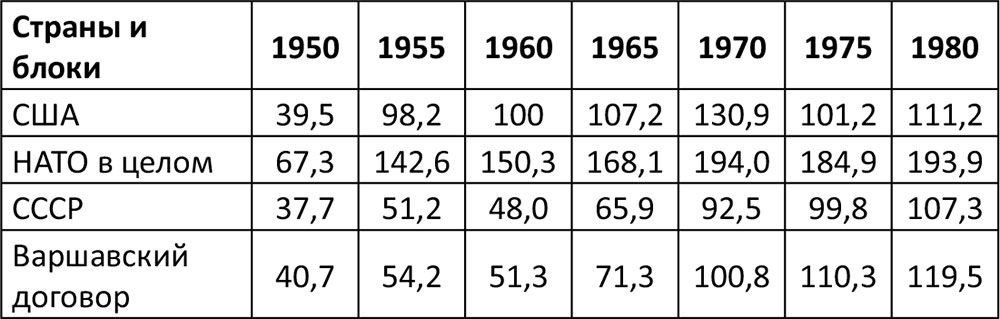 О том, что (и как) именно СССР гнался за Западом в гонке вооружений, свидетельствуют факты. Достаточно взглянуть на цифры из таблицы, опубликованной в Ежегоднике 1981 г. Стокгольмским Институтом исследований мира – SIPRI (Yearbook 1981. Appendix 6A. – P.156. Stockholm International Peace Research Institute).