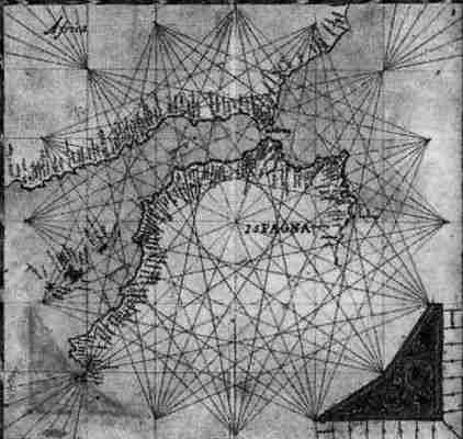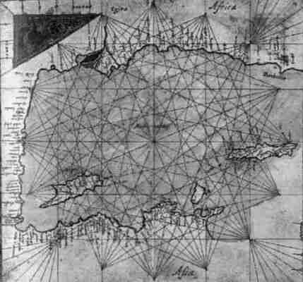 Рис. 33. Старая перевернутая карта части Средиземного моря. Портолан генуэзца Пьетро Весконте (Pietro Vesconte), якобы XIV века [1468]. Север — внизу, восток — СЛЕВА. Вероятно, поэтому восток и назывался ранее LEVANT, то есть расположенный СЛЕВА. Взято из [1468], карта 4.