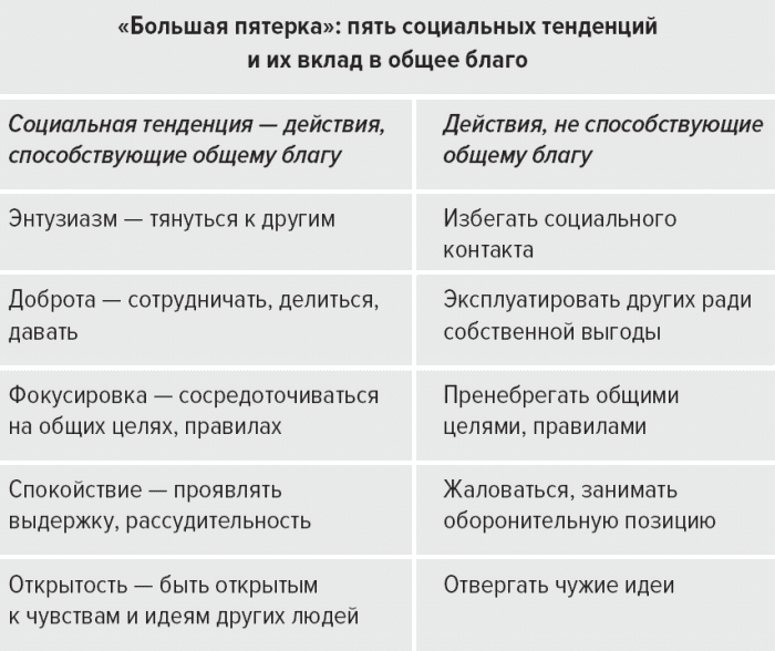 В начале семестра я посетил общежитие и попросил студентов указать уровень «влияния» каждого человека в их корпусе. Они также заполнили анкету с вопросами о том, в какой степени их личность определяется пятью социальными тенденциями, пятью факторами поведения, известными как «большая пятерка»{57}. В представленной ниже таблице я выразил «большую пятерку» в понятных неспециалистам терминах – энтузиазм, доброта, фокусировка, спокойствие и открытость – и для каждого фактора указал действия, которые способствуют или не способствуют общему благу{58}.