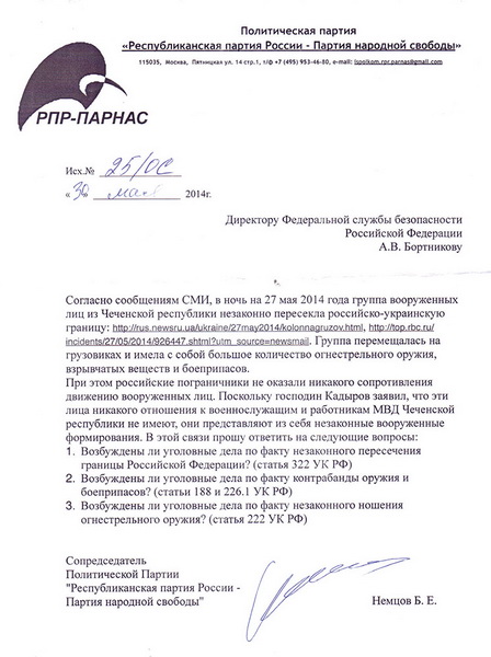 Запрос Бориса Немцова на имя директора ФСБ Александра Бортникова.