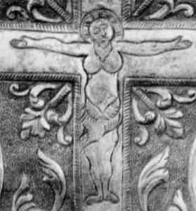Но если в образе Кассиопеи мы видим забытое изображение распятия Иисуса, то возникает вопрос. Почему здесь нарисована ЖЕНЩИНА? Мы не можем дать полного ответа. Однако обратим внимание, что на некоторых старых изображениях распятия Христос имеет как бы женскую грудь, рис. 1.70, 1.71. Сегодня уже неясно, что означала когда-то эта символика. Но факт остается фактом — такая символика действительно существовала.