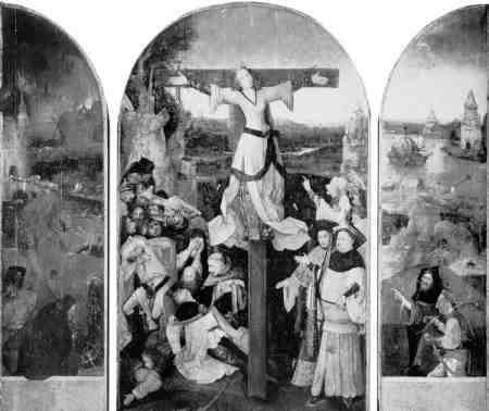 Рис. 1.72. Триптих Иеронима Босха с изображением канонической сцены распятия, однако здесь на кресте распята женщина. Хранится в Венеции, во Дворце Дожей. Взято из [509], с. 260.