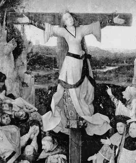 Рис. 1.73. Увеличенный фрагмент триптиха Иеронима Босха. Распятый Христос представлен здесь женщиной. Взято из [509], с. 260.
