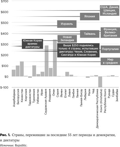 Ниже приведены результаты, рассчитанные на основании данных Angus Maddison и NYU. Из рассмотрения исключены совсем маленькие и архаичные государства, а также те, чей ВВП тотально зависит от внешних факторов (например, карибские офшоры или Бруней, живущий только нефтью и газом). Под «демократией» понимался строй, при котором в стране существует эффективная конкуренция элит и сменяемость власти, даже если в процесс реального выбора вовлечено не все население, — например, демократией считался период с 1991 по 2011 год в России, с 1994 года в Сингапуре и с 1982 года в Китае. Разумеется, граница между демократией и диктатурой довольно размыта, но, как будет видно из результатов, эта граница не так уж и важна — страны, испытавшие диктатуру, «отмечены печатью», даже если диктатура продолжалась недолго. Из рассматриваемых 130 стран за последние 55 лет 60 стран мира испытали периоды как диктатуры, так и демократии, и 26 стран оставались диктатурами в течение всего периода времени.
