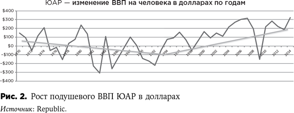 На примере большинства стран интересно наблюдать, как диктатура разрушает рост ВВП, а демократия его создает. На рис. 2 представлен пример Южной Африки. До 1994 года (период апартеида) рост подушевого ВВП замедляется, в момент смены формации он проваливается еще ниже и начинает расти после перехода к демократии. Что бы мы ни говорили про разгул преступности, нежелание местного населения работать, былую аккуратность и трудолюбие буров, подушевой ВВП ЮАР растет при демократии быстрее, чем во времена апартеида.