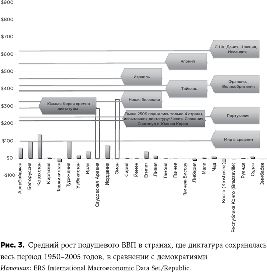 Наконец, как соотносятся показатели роста ВВП на человека в долларах у «убежденных диктатур» с показателями других стран? На рис. 3 представлен средний рост ВВП за 55 лет в этих странах в сравнении с некоторыми демократиями.