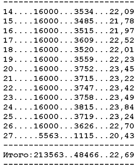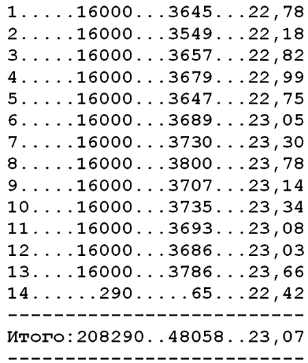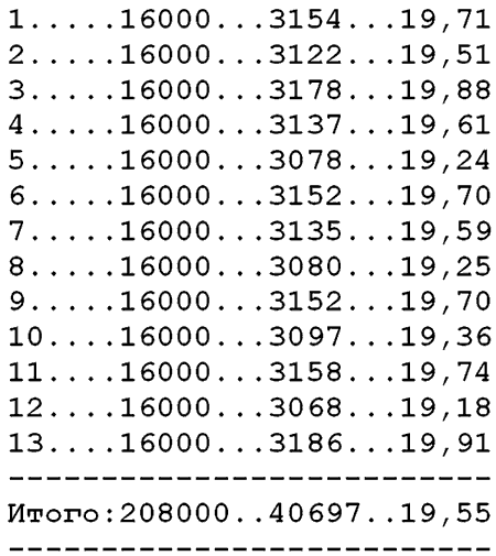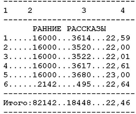 В первом столбце указан номер выборки, во втором столбце — количество слов в выборке, в третьем столбце — количество служебных слов в выборке, в четвертом столбце — процент служебных слов в выборке.