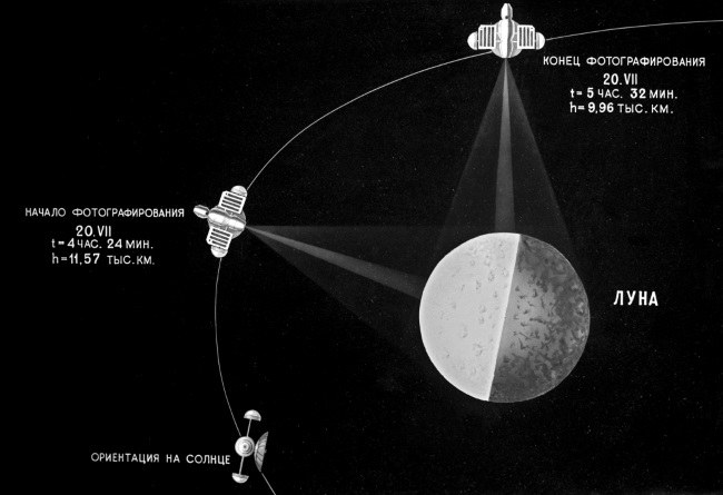 Схема фотографирования Луны автоматической станцией «Зонд-3» (была запущена 18 июля 1965 года). Репродукция.