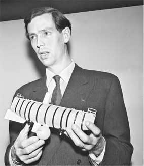 Жак Пикард выступает на пресс-конференции в Вашингтоне, 8 января 1958 года, держа модель батискафа «Триест»