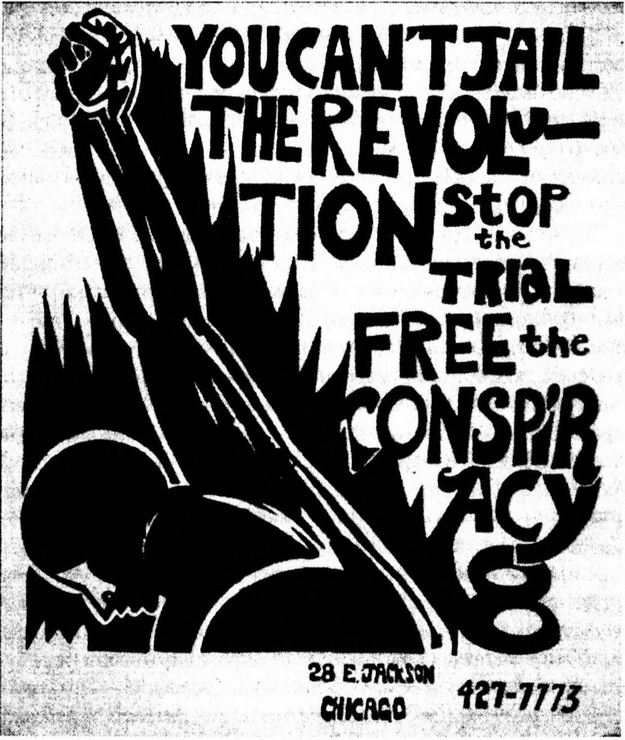 «Революцию не бросить за решетку. Остановите процесс! Освободите членов организации!» Плакат, выражающий протест против попыток федеральной прокуратуры возбудить судебное преследование против организаторов демонстраций во время Чикагской конвенции.