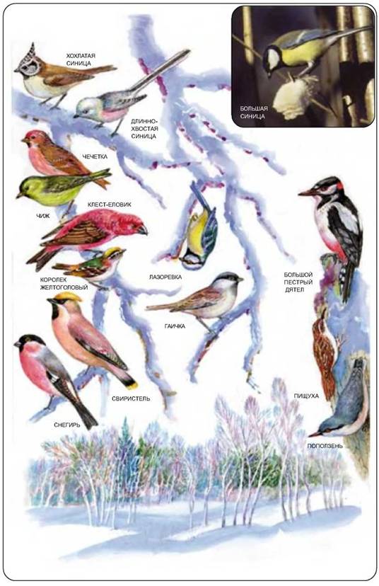 Птицы в зимнем лесу